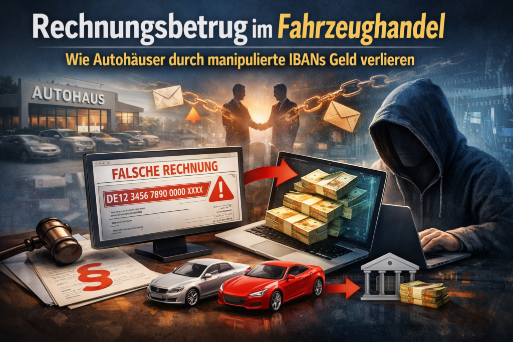 Autohäuser und Fahrzeughändler sind zunehmend von einem konkreten Risiko betroffen: Zahlungen im Fahrzeughandel werden auf falsche Konten umgeleitet – obwohl der Verkauf oder Einkauf eines Fahrzeugs ordnungsgemäß angebahnt wurde.
